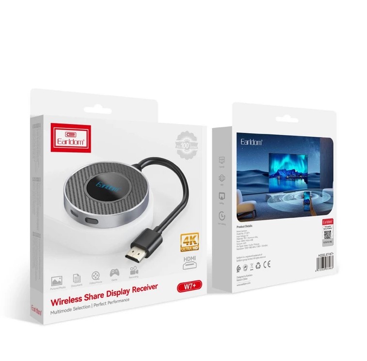 دانگل HDMI تلوزیون ارلدام مدل +ET-W7  یک مبدل بی‌سیم حرفه‌ای است که امکان انتقال تصویر، ویدئو و صدا از گوشی، تبلت یا لپ‌تاپ به تلویزیون و پروژکتور را فراهم می‌کند. با استفاده از این دانگل، می‌توانید محتوای گوشی خود را روی صفحه‌نمایش‌های بزرگ بدون نیاز به کابل اضافی پخش کنید.
