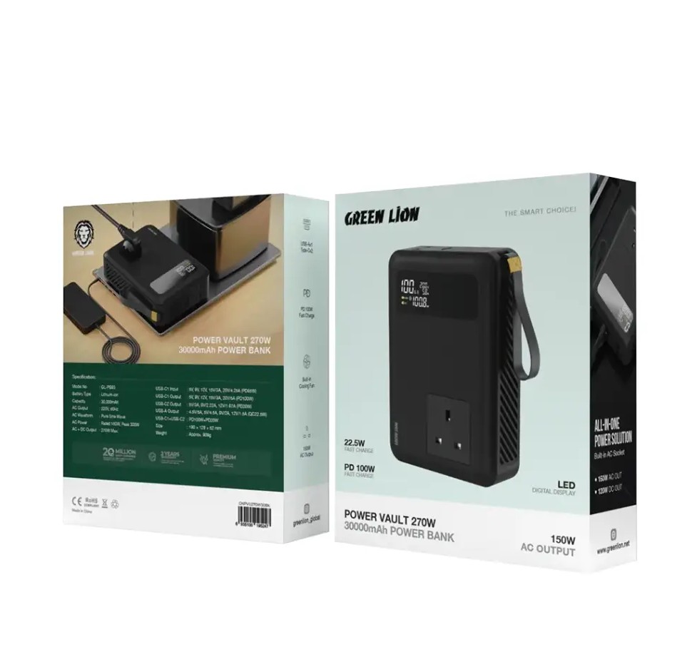 اگر بهدنبال یک پاوربانک قدرتمند و همهکاره برای شارژ همزمان لپتاپ، موبایل، تبلت و حتی وسایل خانگی کوچک هستید، پاوربانک 30000 میلیآمپر گرین لاین مدل Power Vault 270W یکی از بهترین انتخابهای موجود در بازار است. این دستگاه نه تنها ظرفیت بالایی دارد، بلکه با داشتن خروجی AC، پورتهای قدرتمند PD و QC و فن خنککننده داخلی، یک پاوربانک حرفهای برای استفادههای سنگین به شمار میرود.