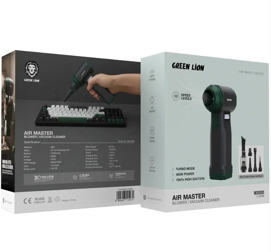 دمنده و گردگیر شارژی گرین لاین مدل Air Master یک ابزار قدرتمند و چندکاره برای تمیزکاری حرفهای در خانه، محل کار، خودرو و تجهیزات الکترونیکی است. این دستگاه با موتور براشلس DC 40 میلیمتری و توان بالای ۴۰۰ وات طراحی شده و با رسیدن به سرعت خیرهکننده ۹۰,۰۰۰ دور در دقیقه، جریان هوایی فوقالعاده قوی ایجاد میکند که حتی سرسختترین گرد و غبارها را هم بهراحتی از بین میبرد.