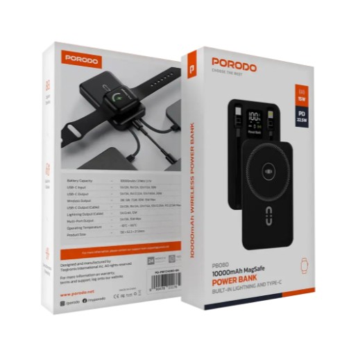 پاوربانک Porodo PB080 با ظرفیت 10000 میلی‌آمپر ساعت، برای کاربرانی طراحی شده که علاوه بر شارژ باسیم، به شارژ بی‌سیم (مگ‌سیف) نیز نیاز دارند. این مدل با قابلیت پشتیبانی از PD و شارژ سریع 22.5 واتی، توانایی شارژ انواع گوشی‌ها و گجت‌ها را با سرعت بالا فراهم می‌کند. وجود کابل‌های داخلی، نمایشگر دیجیتال و امکان شارژ هم‌زمان چند دستگاه، آن را به یک همراه همه‌کاره برای سفر، کار و استفاده روزمره تبدیل کرده است.